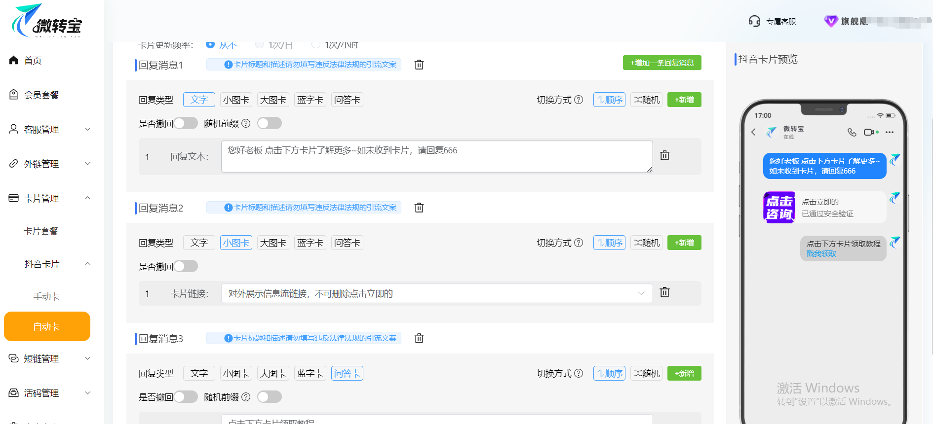 抖音用户咨询时间不固定,无论是深夜咨询、节假日问询,还是直播、爆款视频带来的瞬时海量私信,人工都难以做到全程无缝接待。微转宝抖音自动回复卡片,可实现全天候自动化回复,用户只要进入私信界面或触发指定关键词,系统即刻推送专属回复卡片,无需人工值守,彻底告别回复延迟、咨询漏回的问题,牢牢抓住每一个潜在客户,不让任何商机因为无人回应而溜走。